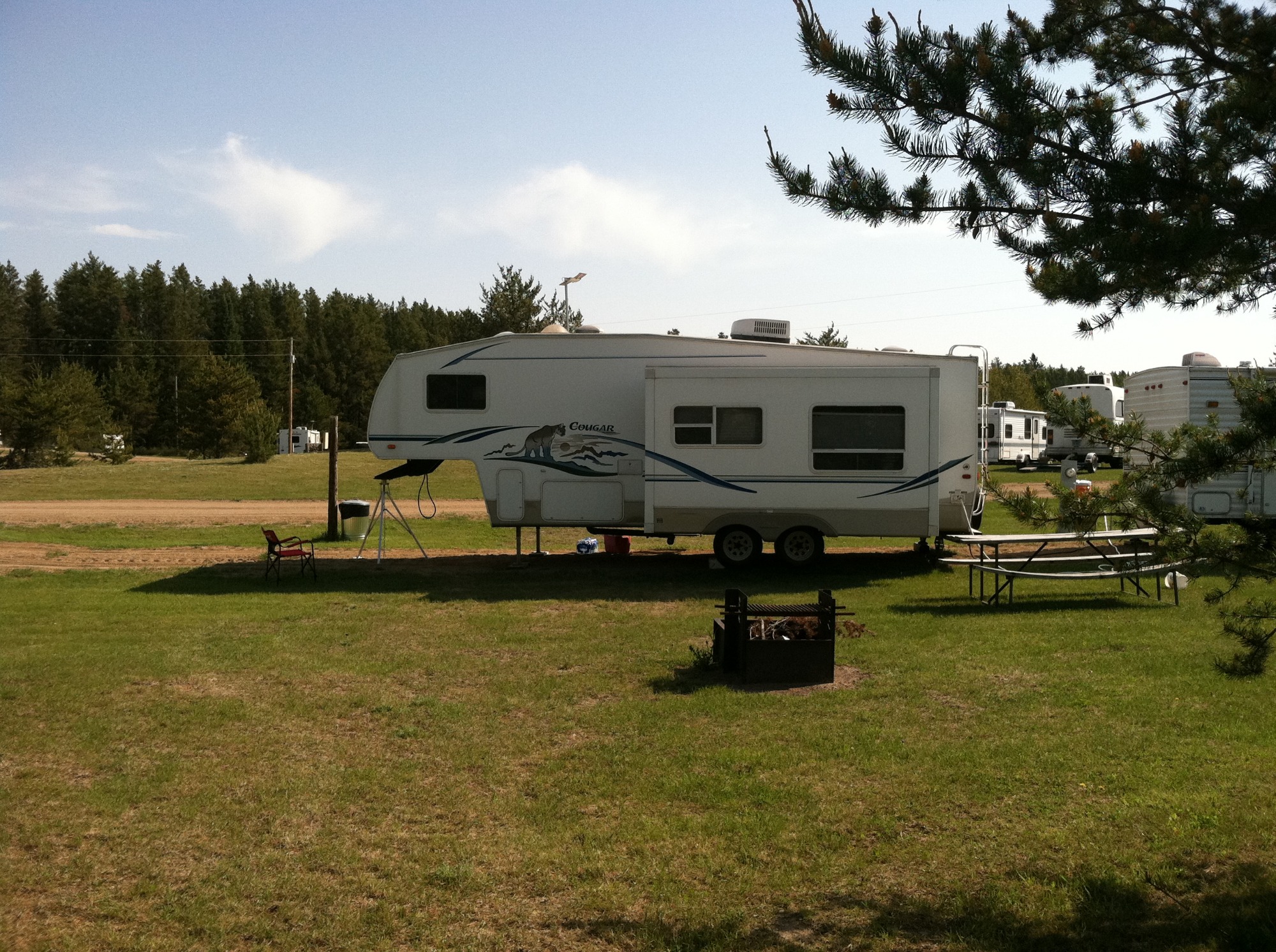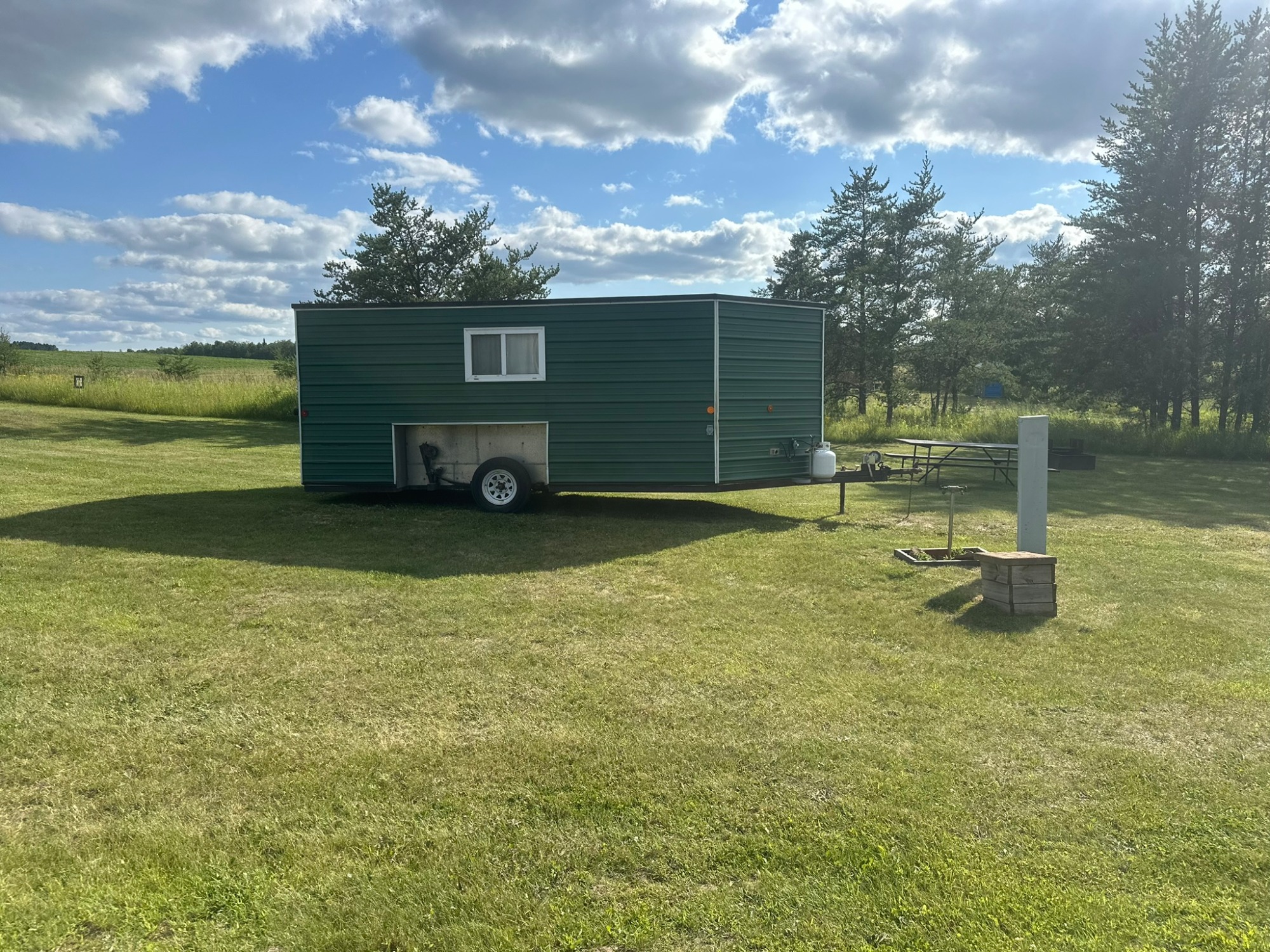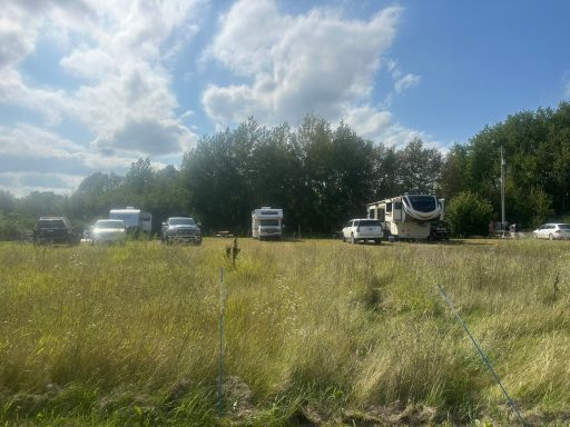 Sites have 50amp electricity and water:) Each has a picnic table and a fire ring as well. There is a central RV dump available in the main campground for your departure. You must have a bathroom on board your RV to stay here, no tents are allowed unless they are paired with a camper. Situated by the entrance and our shop, up against a wind row of beautiful popple trees that shade the hot western sun but still let the sunset peak through the trees!